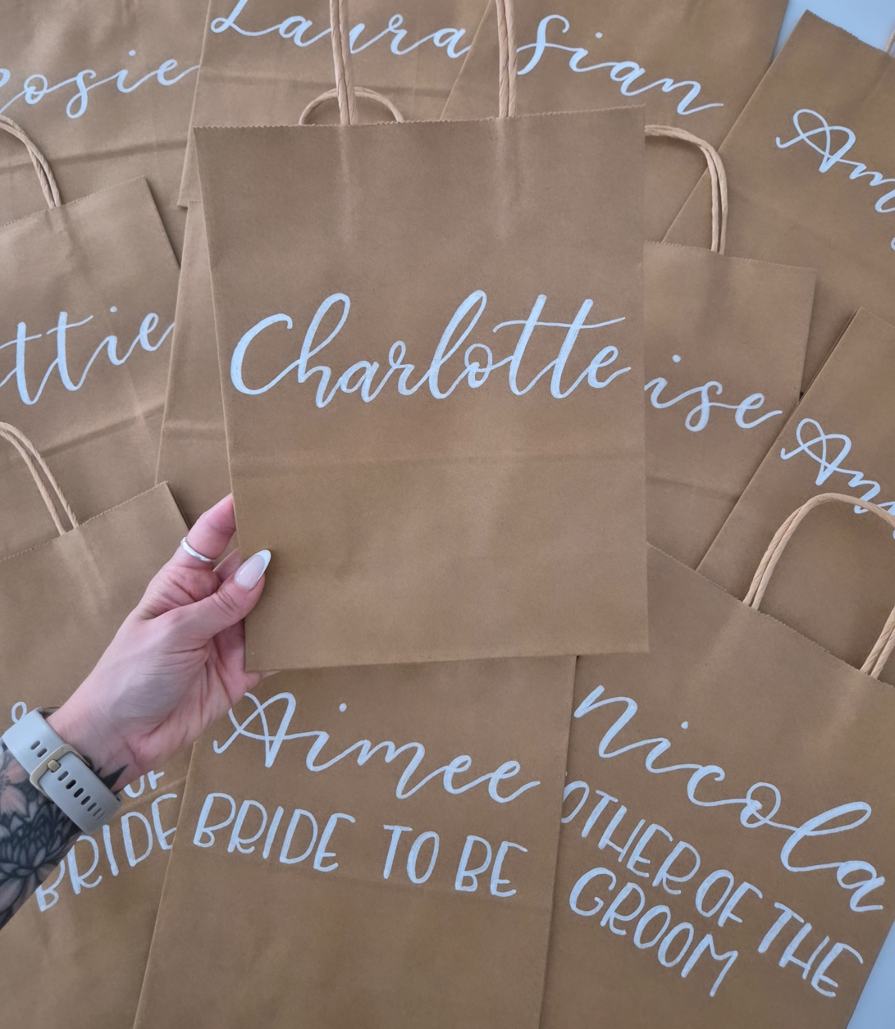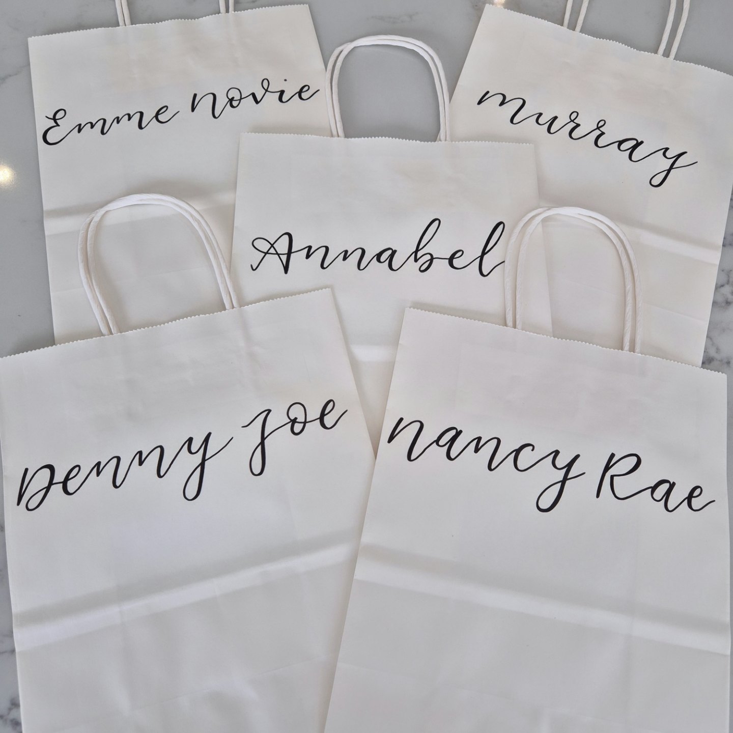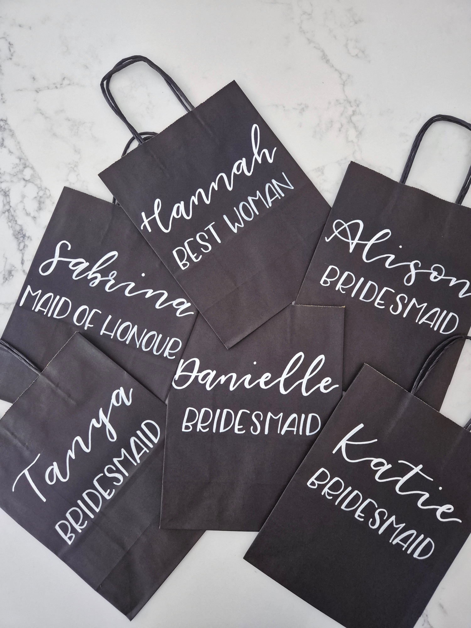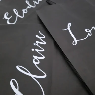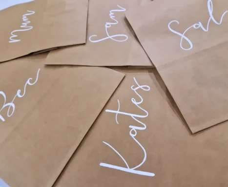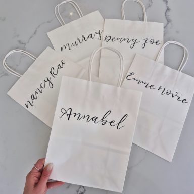 Available in kraft brown, white or black bags & hand written in white, black or gold ink