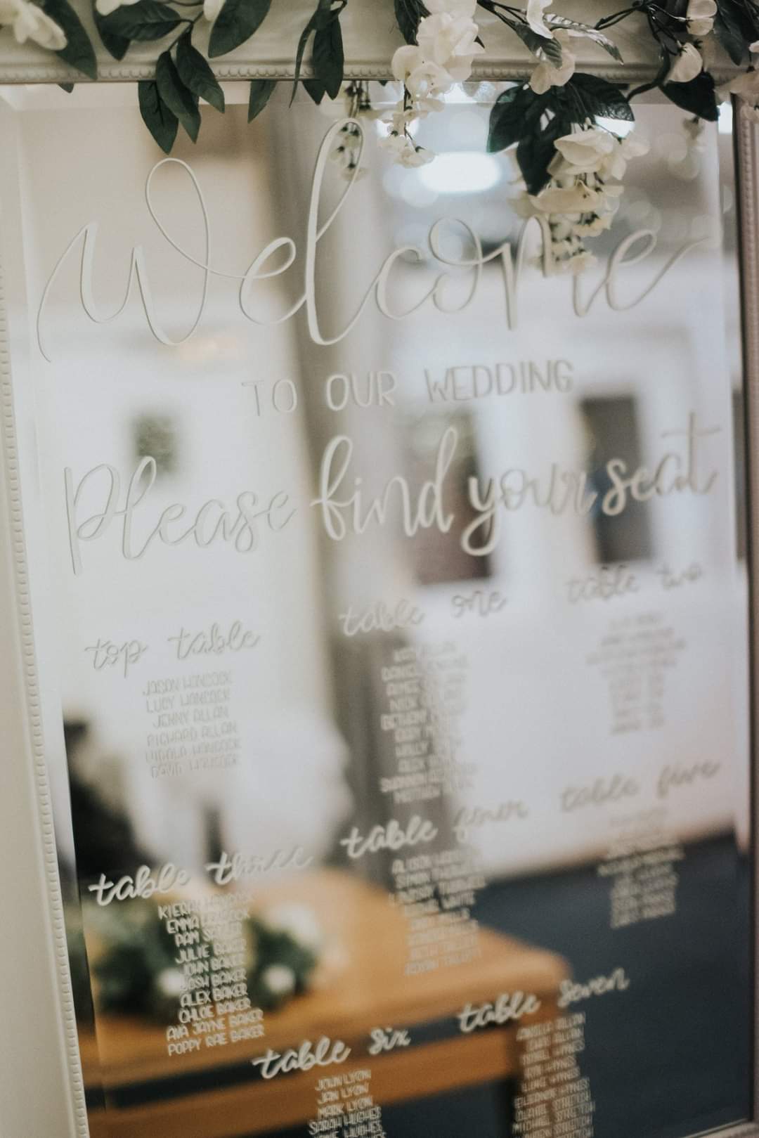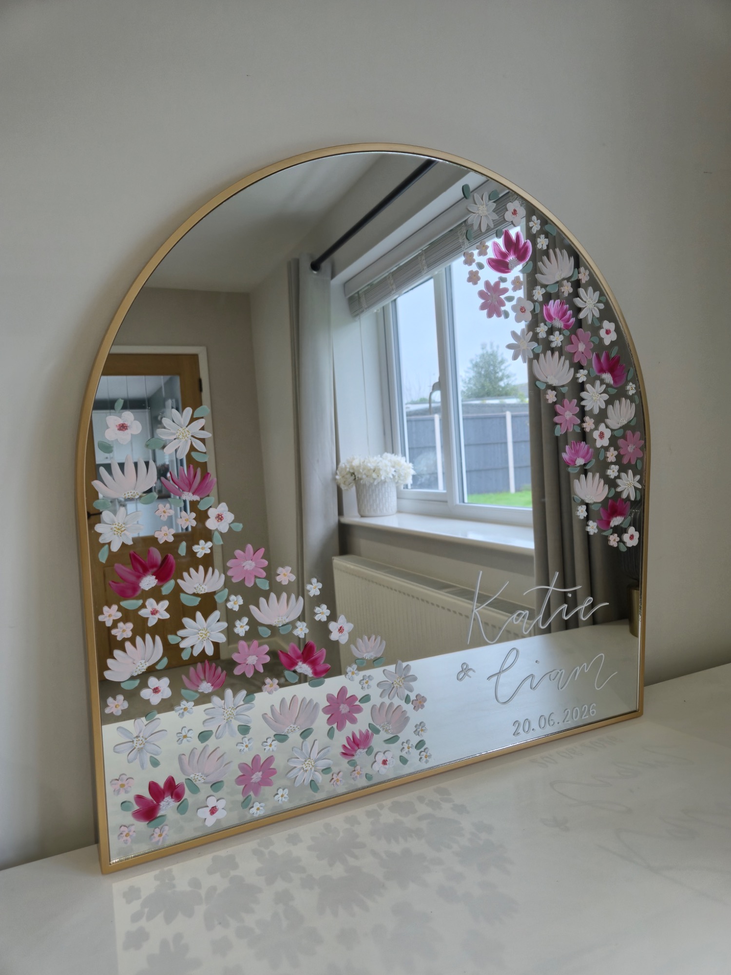 Each mirror is lovingly hand painted with florals and designed to match your colour scheme. Personalised with your names and special date, a perfect welcome to any event and beautiful keepsake to remember the day by